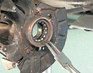 With circlip pliers, remove the bearing – locating circlips from both sides of the steering knuckle’s bearing – housing hole.